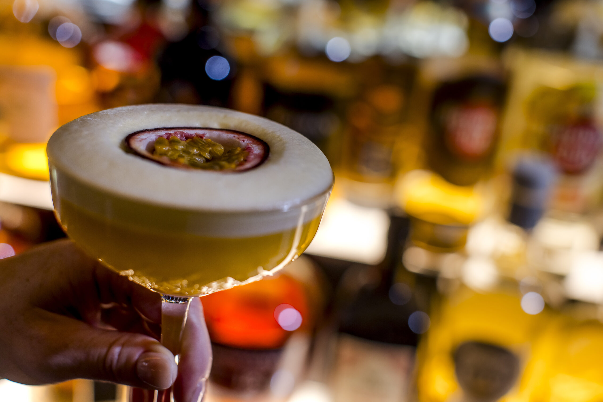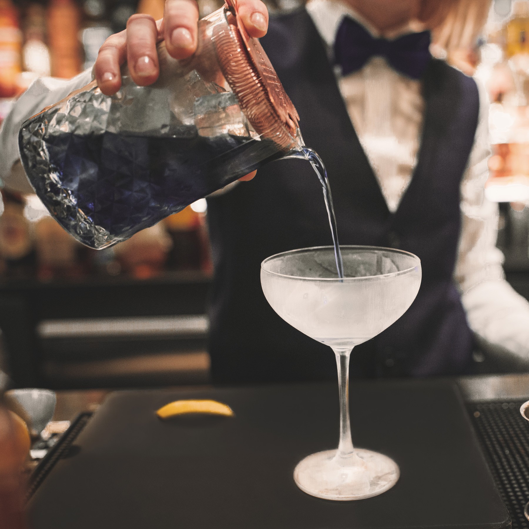 Stylishly arranged cocktail with vodka bottle, champagne mini and water glass on a golden side table in the elegant lounge of The Wellem Bar.
