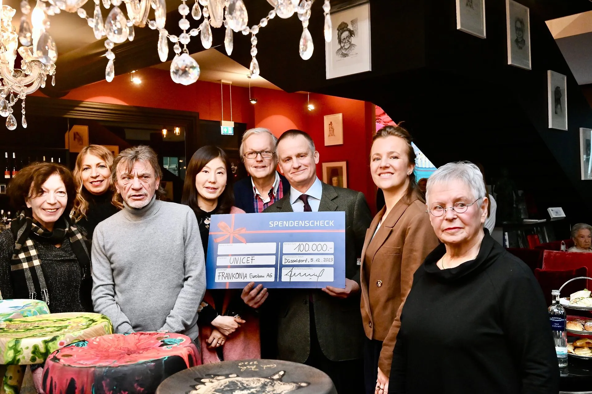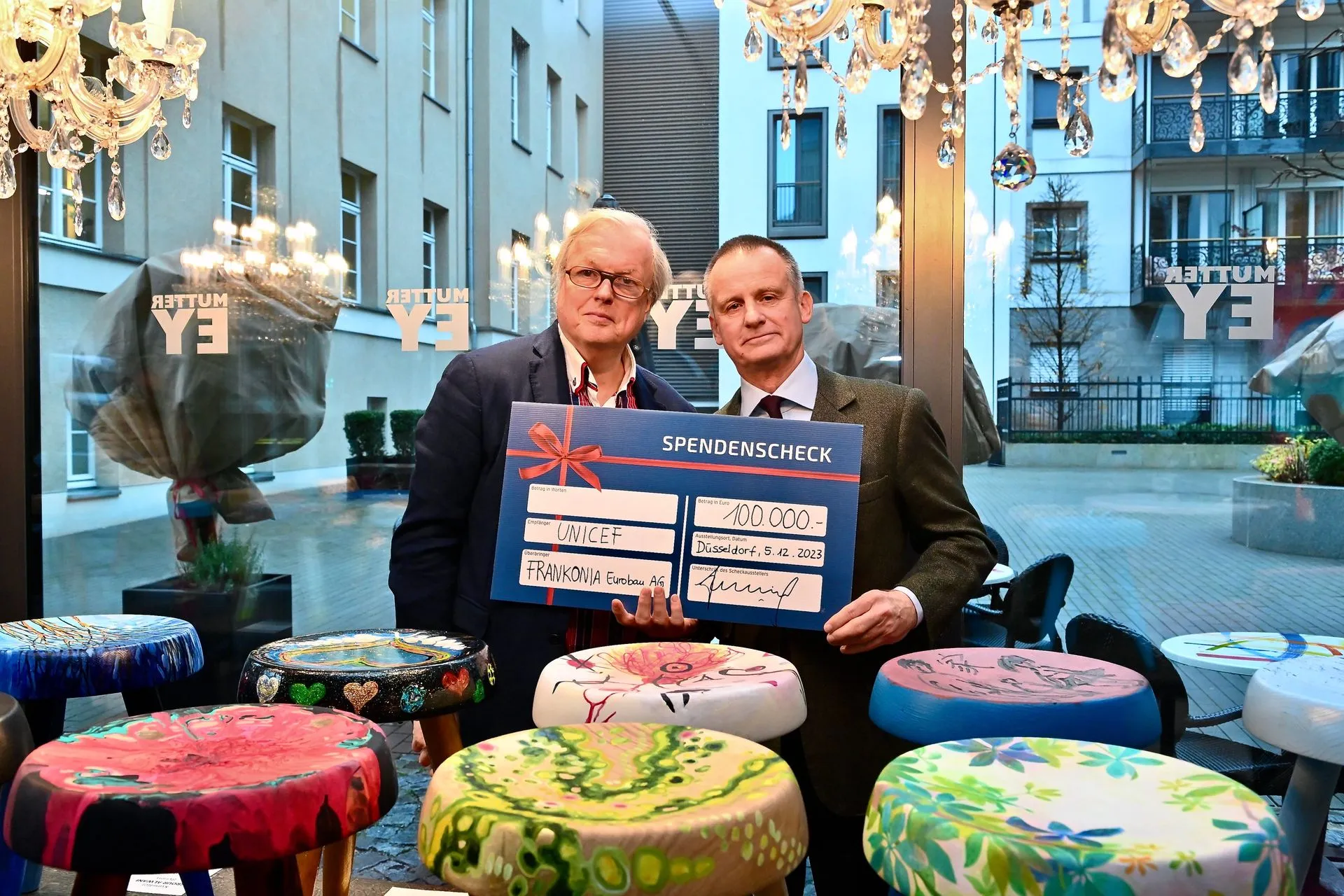 Bei der heutigen Vernissage der Unicef-Kunstauktion „Kinderrechte – Ein Platz für jedes Kind“ im Café Mutter-Ey überreichte der Gründer der Frankonia Eurobau AG Uwe Schmitz einen Scheck über 100.000 Euro an Unicef. Die Spendenaktion ist das Ergebnis eines mehrjährigen Kunstprojekts von Unicef Deutschland-Mitglied Heribert Klein, bei dem von Künstlern gestaltete Kinderschemel versteigert wurden. Der gesamte Erlös geht an Kinderhilfsprojekte in der Ukraine.